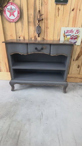 Bring timeless charm into your home with this beautifully crafted console. Finished in a rich gray with hand-distressed edges, this piece combines elegance and character for a look that feels both refined and lived-in. The scalloped apron and curved details add a touch of French country flair, while the open shelving provides practical storage or display space for books, baskets, or decorative accents.