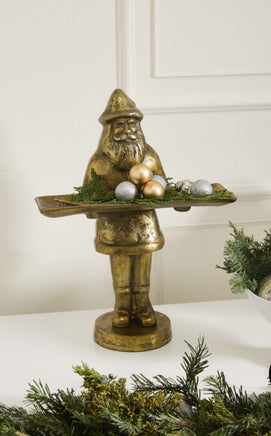 What would the holidays be without a classic Santa? Display the Saint Nick Dish Stand as a charming and cheerful addition to holiday decor. This cast aluminum Santa holds an attached rectangular tray, and has a warm antique gold finish. While not meant for serving food, the tray is perfect for styling with ornaments or other holiday notions.