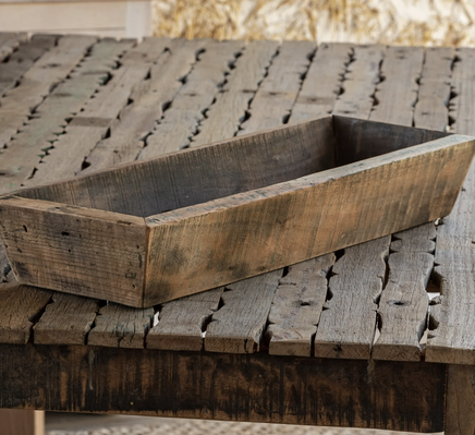 This rustic wooden vessel is long and narrow, just like a feed trough on the farm. It is perfect to use for seasonal, tabletop displays